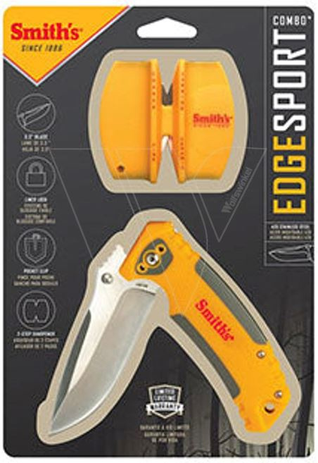 The Smith's Edgesport combo includes the Smith's EdgeSport 3.3" drop point blade features a rugged satin finish The razor sharp blade is made of precision heat treated 400 series stainless steel with an ambidextrous thumb screw for easy opening. Equipped with rugged soft grip custom handles and sturdy liner lock design secures the blade open during use. The EdgeSport includes a reversible pocket clip.