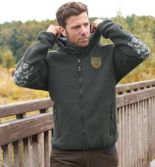 Modern men's jacket with traditional elements. In a beautiful combination of materials: warm, comfortable knitted jacket. The Hubertus Walkstrick Hoodie has knitted reinforcement on the inner collar and elbows with patterns. The warm knitted hoodie jacket has a robust zipper, two side pockets and elastic edging on the sleeves and bottom. 80% Lamswool, 20% Polyamid