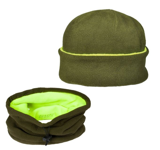 Heerlijke warme omkeerbare muts en nekwarmer van fleece. De Skogen Reversible fleece muts met nekwarmer zijn verkrijgbaar in de kleuren olijf/oranje en olijf/geel.