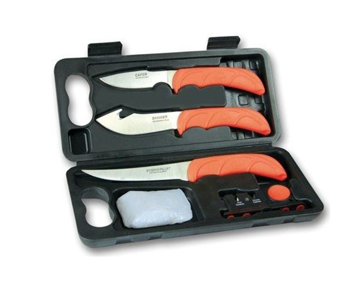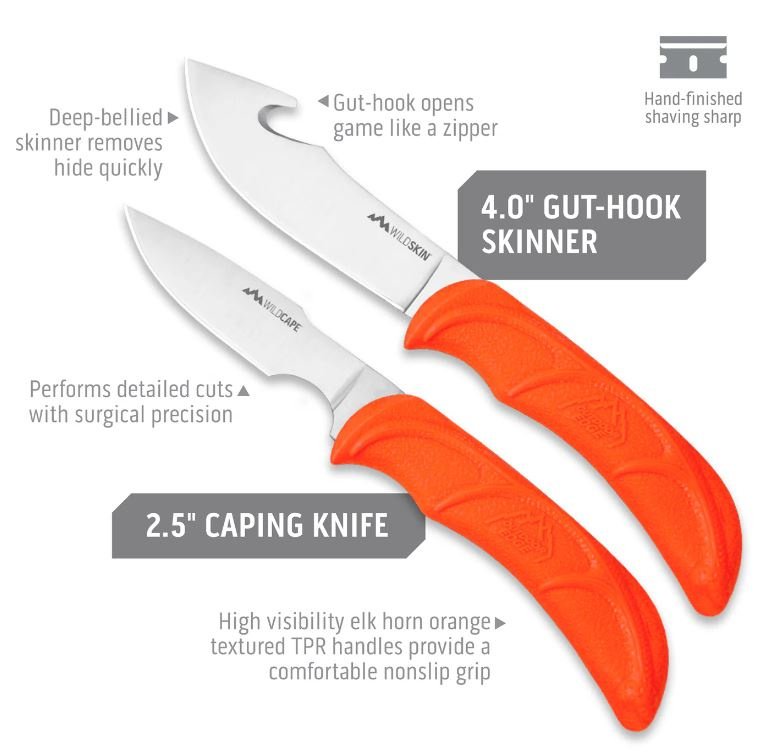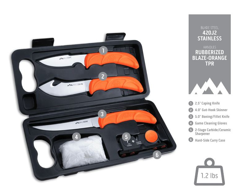 Compact knife set with hard-side carry case is perfect for field use and home processing. Weighing just 20 ounces, this complete 6-piece set includes a full-tang caping knife, gut-hook skinner, boning/fillet knife, game cleaning gloves and two-stage ceramic/carbide sharpener to maintain a razor edge at all times. The 420J2 stainless steel blades are precisely heat treated and hand finished shaving-sharp. Rubberized, blaze-orange TPR handles offer high visibility in the field and ensure a non-slip grip, even when wet. Additionally, the elk horn inlay provides extra indexing points for greater control, and prevent fatigue during long use. Ensure the quality of the meat for your family and save the cost of commercial processing with the WildLite.